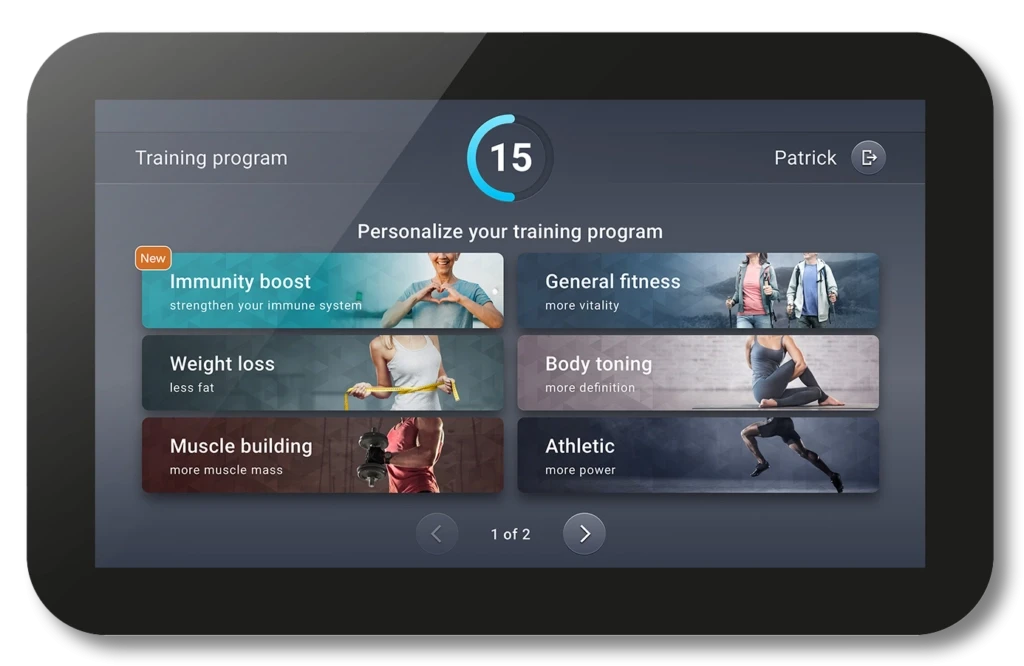 Je nach gewähltem eGym Trainingsprogramm variieren sowohl die Trainingsmethoden als auch die Parameter Gewicht, Wiederholungszahl, Bewegungsgeschwindigkeit und Dauer. Sie werden individuell für Dich berechnet. Abnehmen, Allgemeine Fitness, Athletik, Figurtraining, Metabolic Fit, Muskelaufbau, Reha Fit – wähle Dein Ziel und los geht’s!