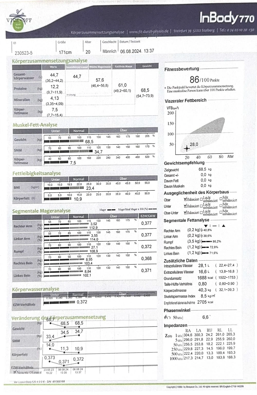Ihre Trainingserfolge: Mit dem InBody-Check machen wir Ihre Erfolge sichtbar. Der ausführliche Ergebnisbogen zeigt u.a. Muskelaufbau und Fettabbau und dient als Grundlage für Ihren Trainingsplan.